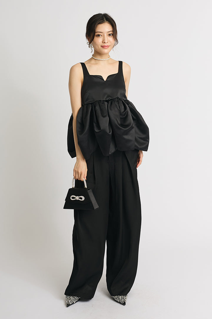 【SET】ボリュームパフサテントップ+サテンワイドパンツ(2set)