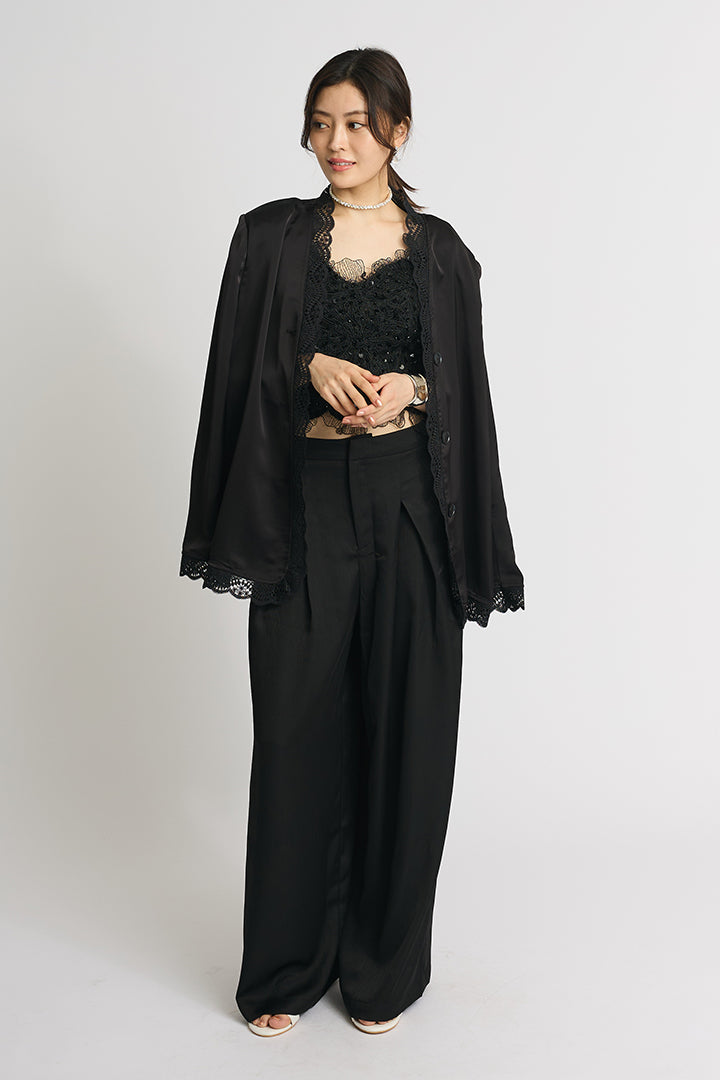 【SET】レーストリムサテンジャケット+バタフライレースキャミソール+サテンワイドパンツ(3set)