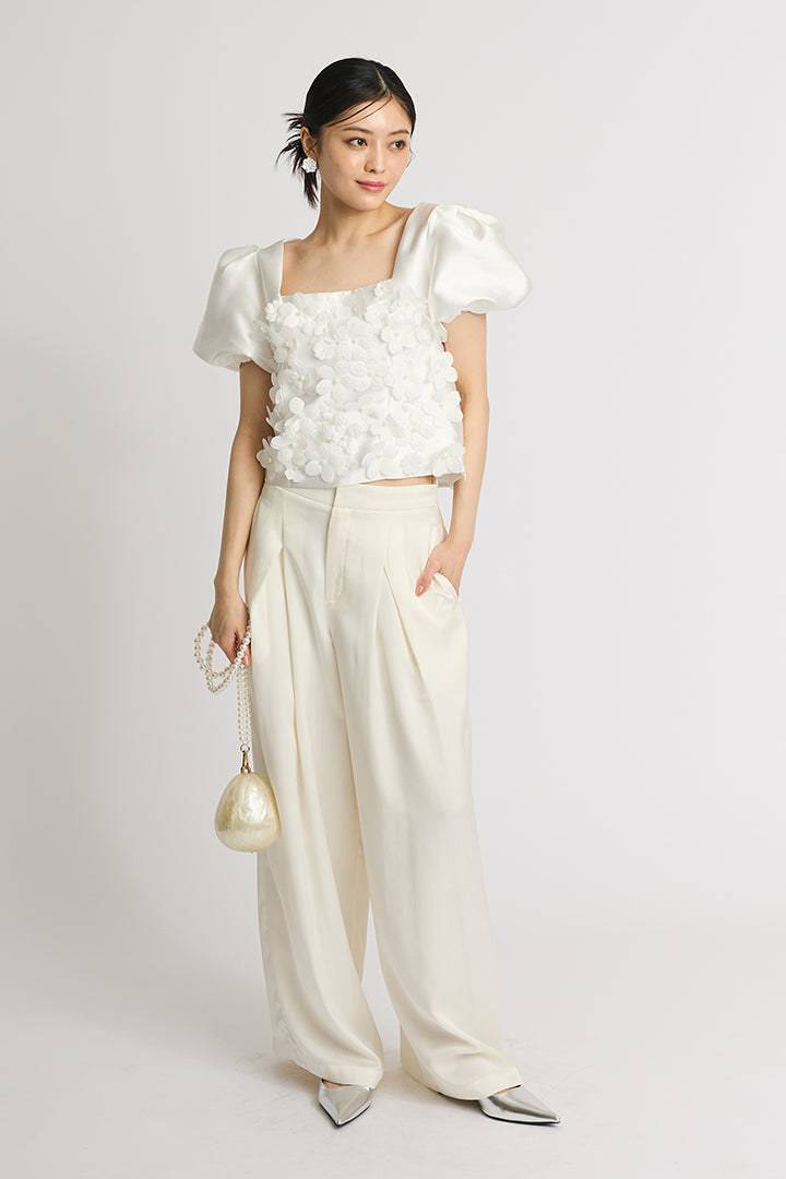 【SET】ミニフラワーオフショル+サテンワイドパンツ(2set)