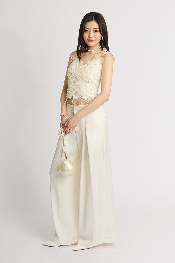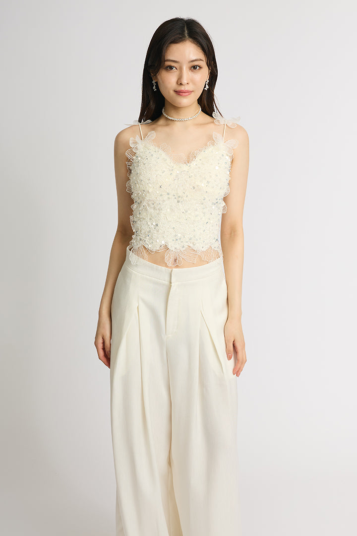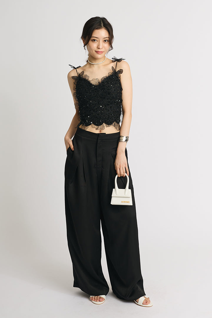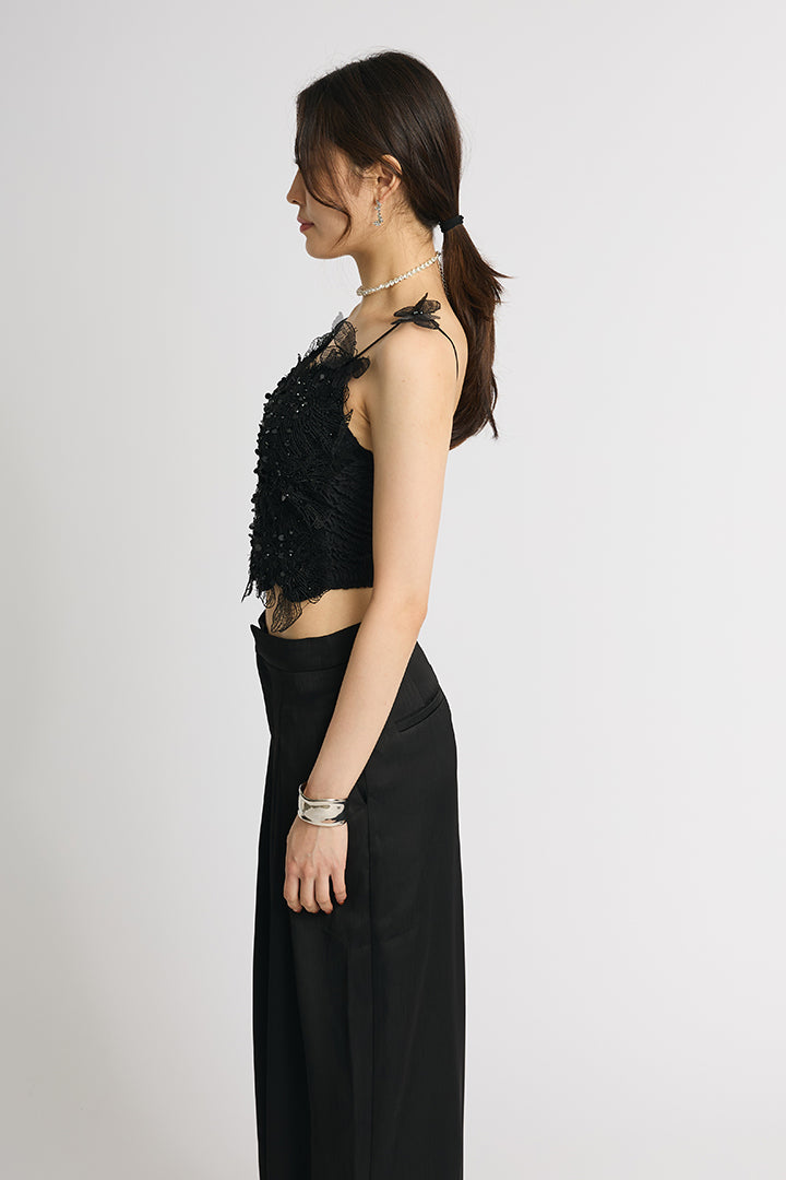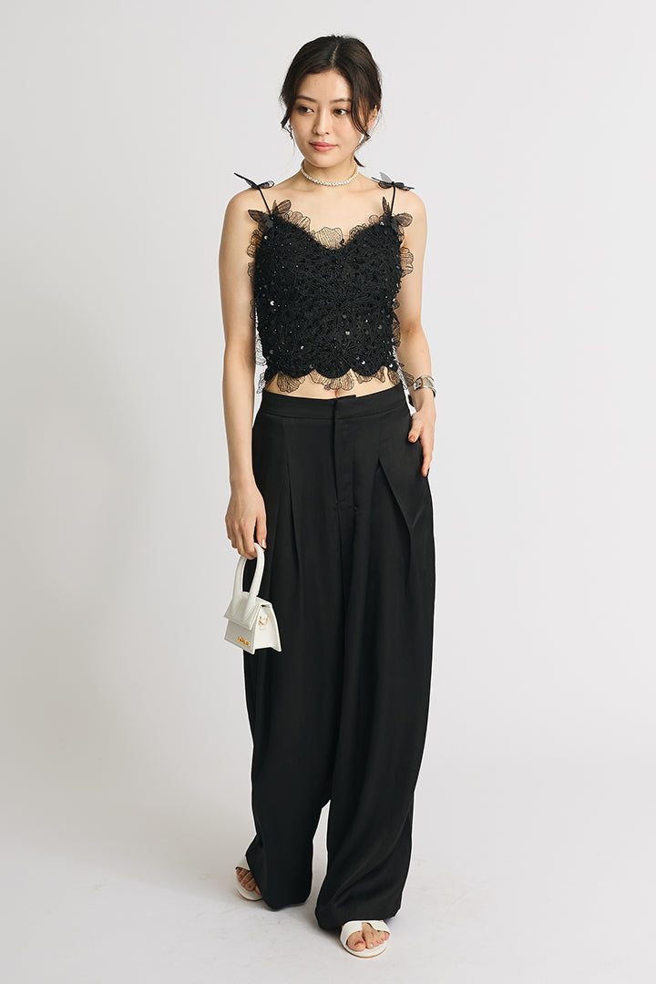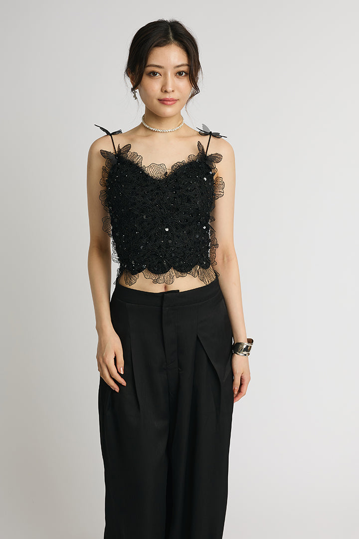繊細なレースにスパンコールを散りばめた華やかなキャミソールトップス。 肩にあしらわれた立体的なバタフライモチーフが視線を引き寄せ、フェミニンかつ個性的な印象に仕上げています。 ボディにはフラワー調のレースを贅沢に使い、程よい透け感と立体感で大人の可愛さを演出。 ホワイトは軽やかでロマンティックに、ブラックはシックでモードなスタイルに仕上がる、2色展開。 デニムと合わせてカジュアルダウンしたり、ワイドパンツやタイトスカートでドレスアップしたりと着こなしの幅が広がる一枚です。