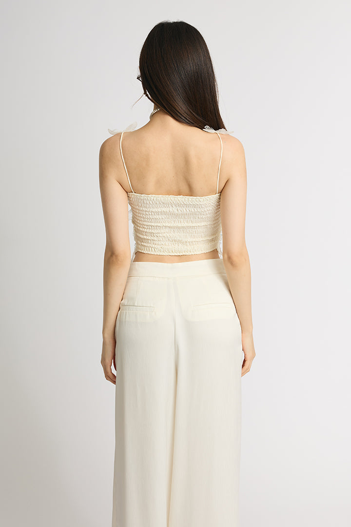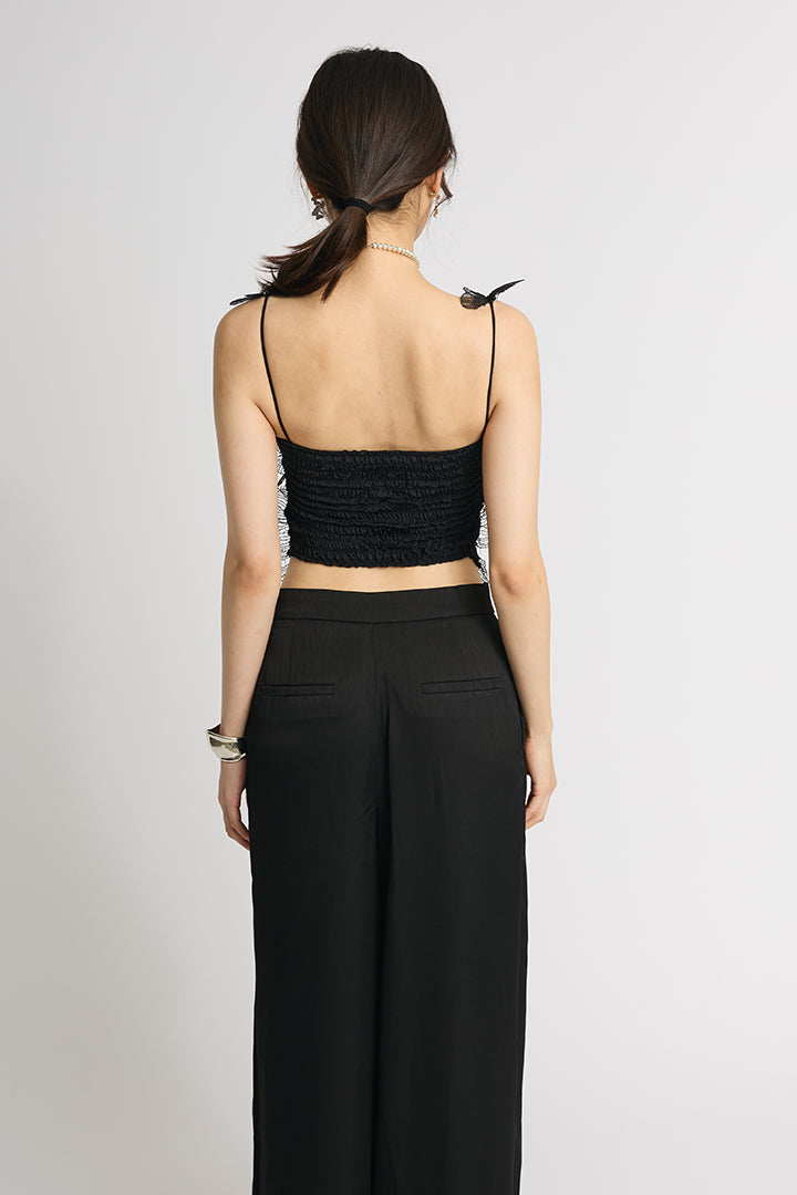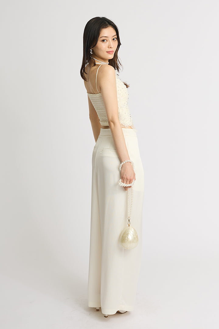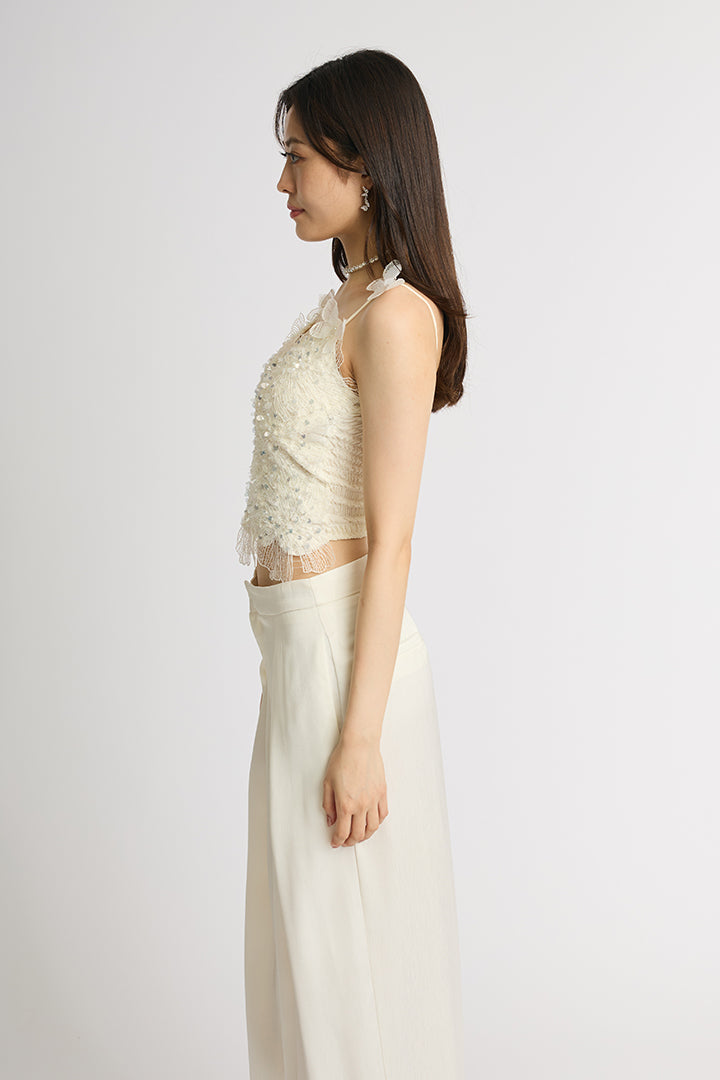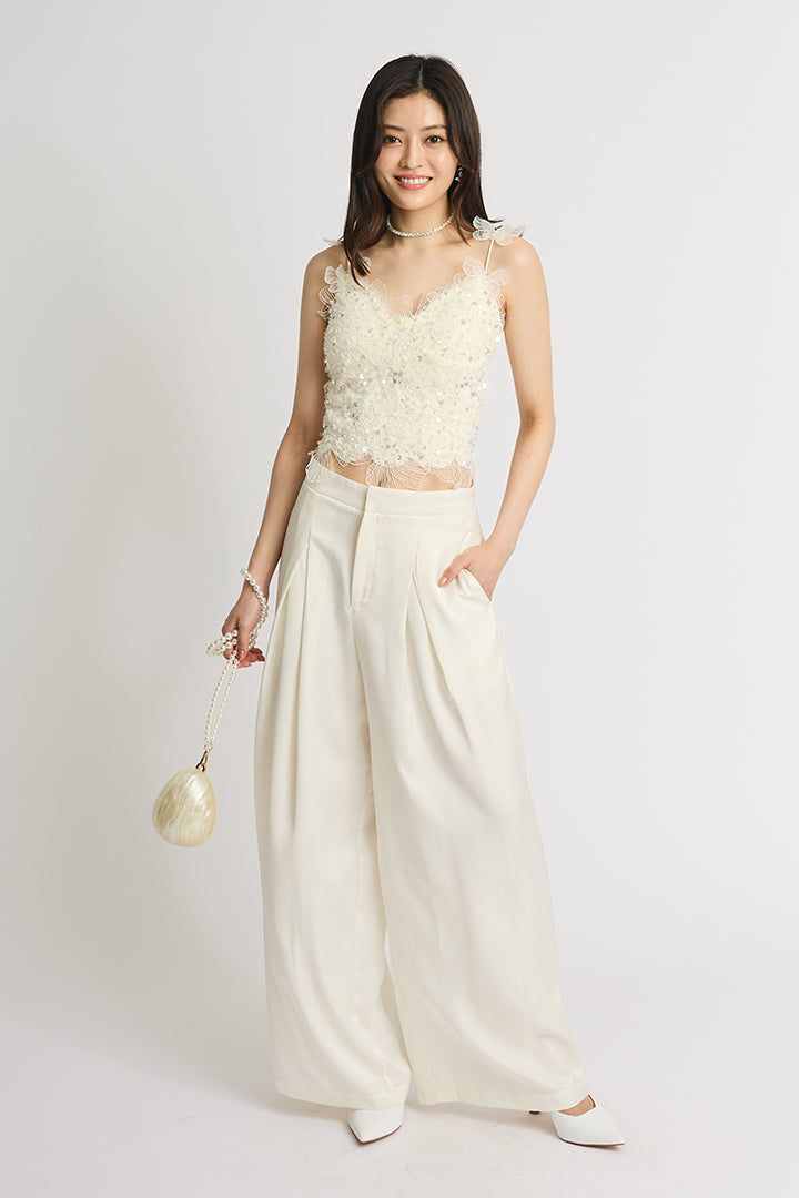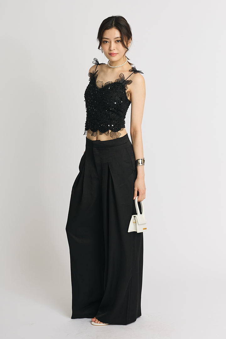 繊細なレースにスパンコールを散りばめた華やかなキャミソールトップス。 肩にあしらわれた立体的なバタフライモチーフが視線を引き寄せ、フェミニンかつ個性的な印象に仕上げています。 ボディにはフラワー調のレースを贅沢に使い、程よい透け感と立体感で大人の可愛さを演出。 ホワイトは軽やかでロマンティックに、ブラックはシックでモードなスタイルに仕上がる、2色展開。 デニムと合わせてカジュアルダウンしたり、ワイドパンツやタイトスカートでドレスアップしたりと着こなしの幅が広がる一枚です。