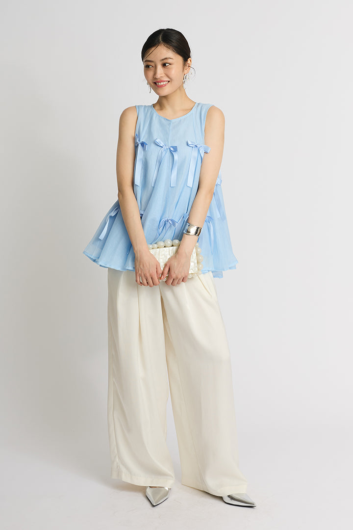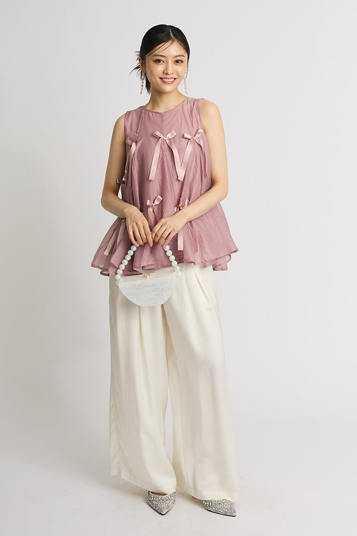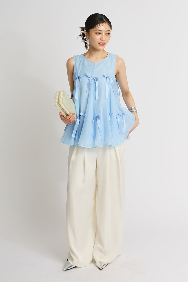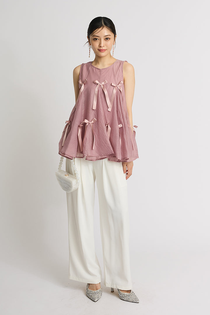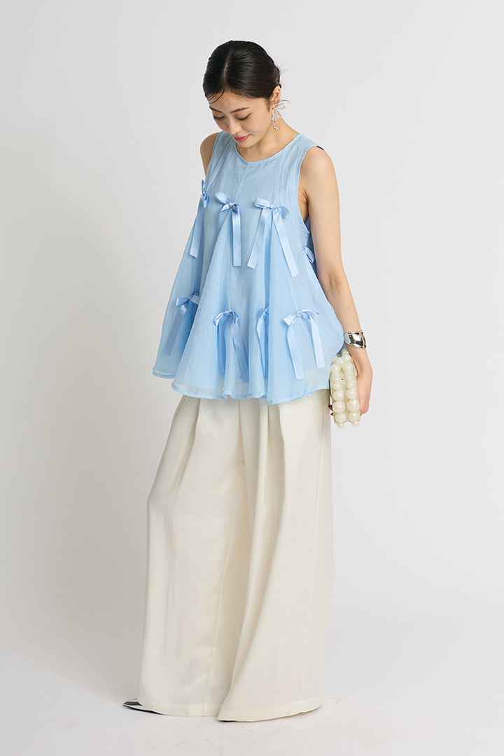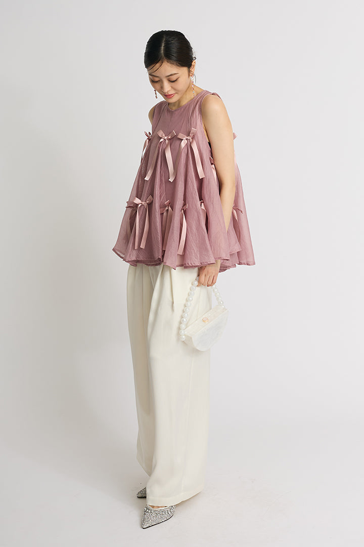 ふわりと広がるAラインシルエットに、可憐なサテンリボンをランダムにあしらったチュールトップス。軽やかな透け感と立体感のあるリボンが動くたびに揺れて視線を集めます。ボリュームがありながらもシアー素材なので抜け感があり、ワイドパンツやスリムパンツと合わせるだけで、洗練されたモード感漂うコーデに。結婚式の二次会からカジュアルなパーティまで、幅広いシーンに活躍する一着です。