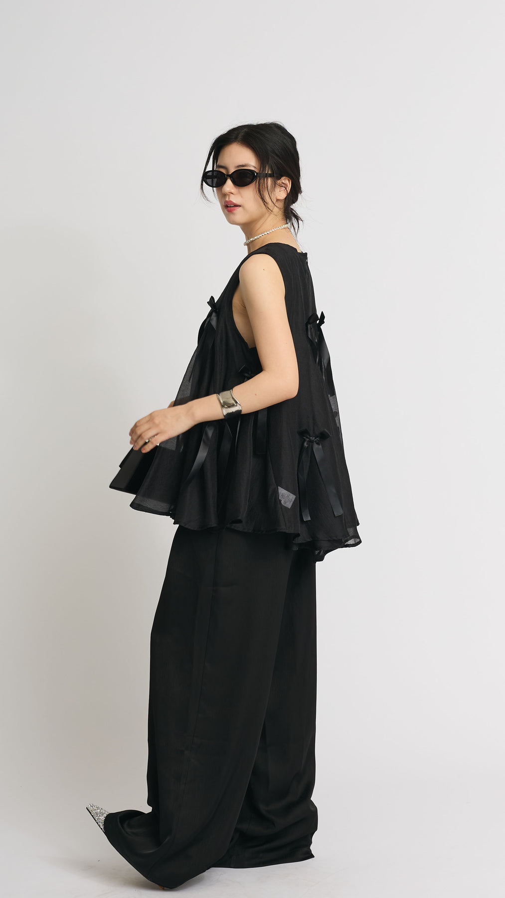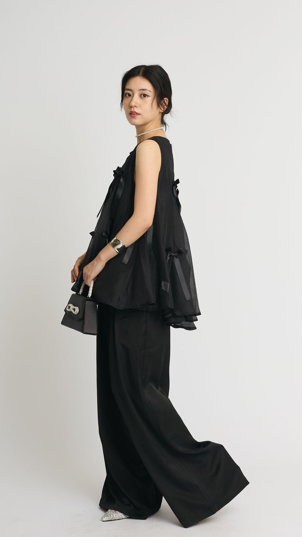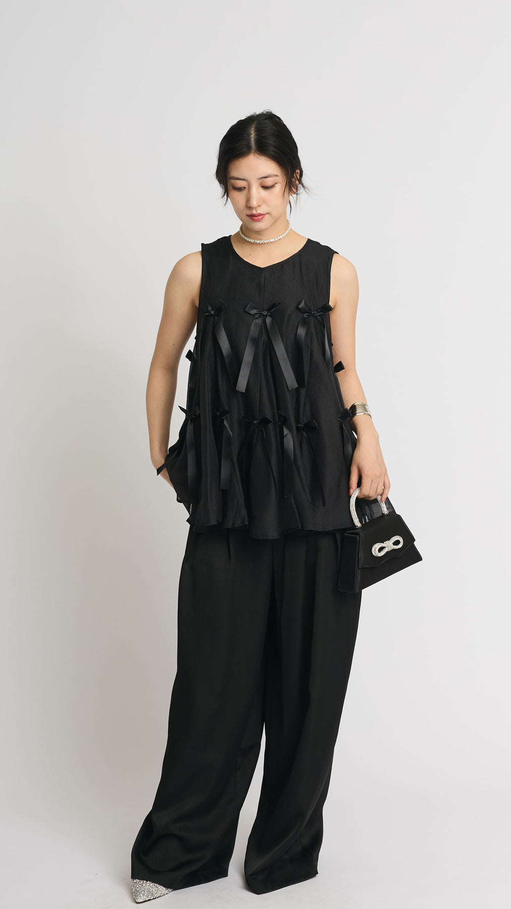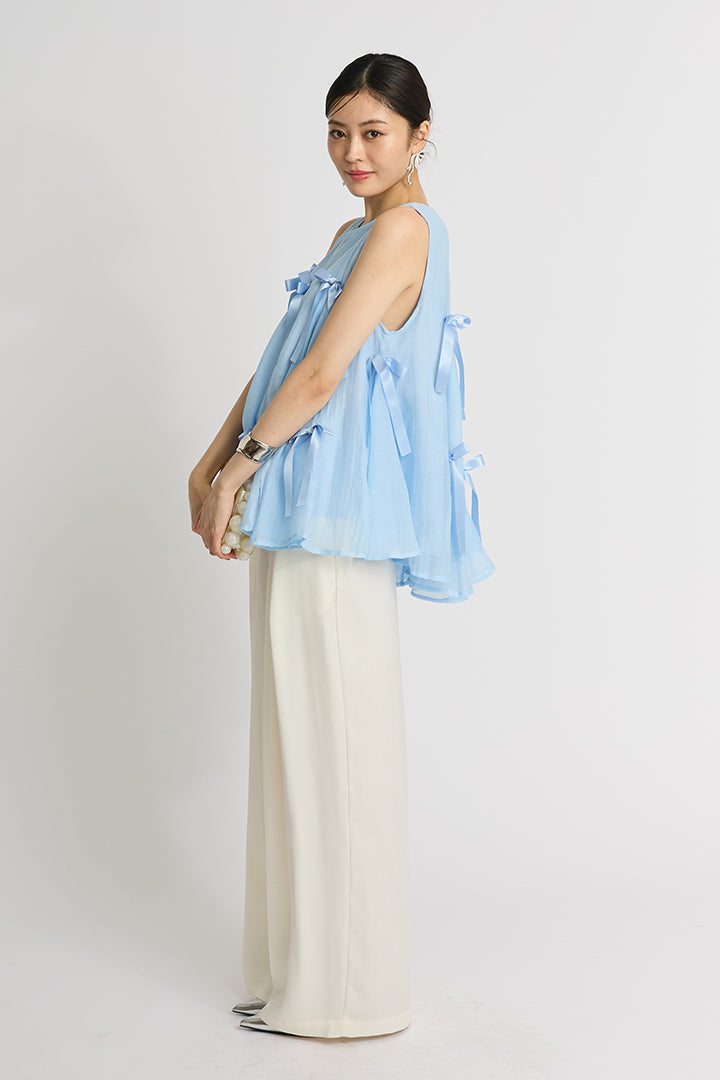 ふわりと広がるAラインシルエットに、可憐なサテンリボンをランダムにあしらったチュールトップス。軽やかな透け感と立体感のあるリボンが動くたびに揺れて視線を集めます。ボリュームがありながらもシアー素材なので抜け感があり、ワイドパンツやスリムパンツと合わせるだけで、洗練されたモード感漂うコーデに。結婚式の二次会からカジュアルなパーティまで、幅広いシーンに活躍する一着です。