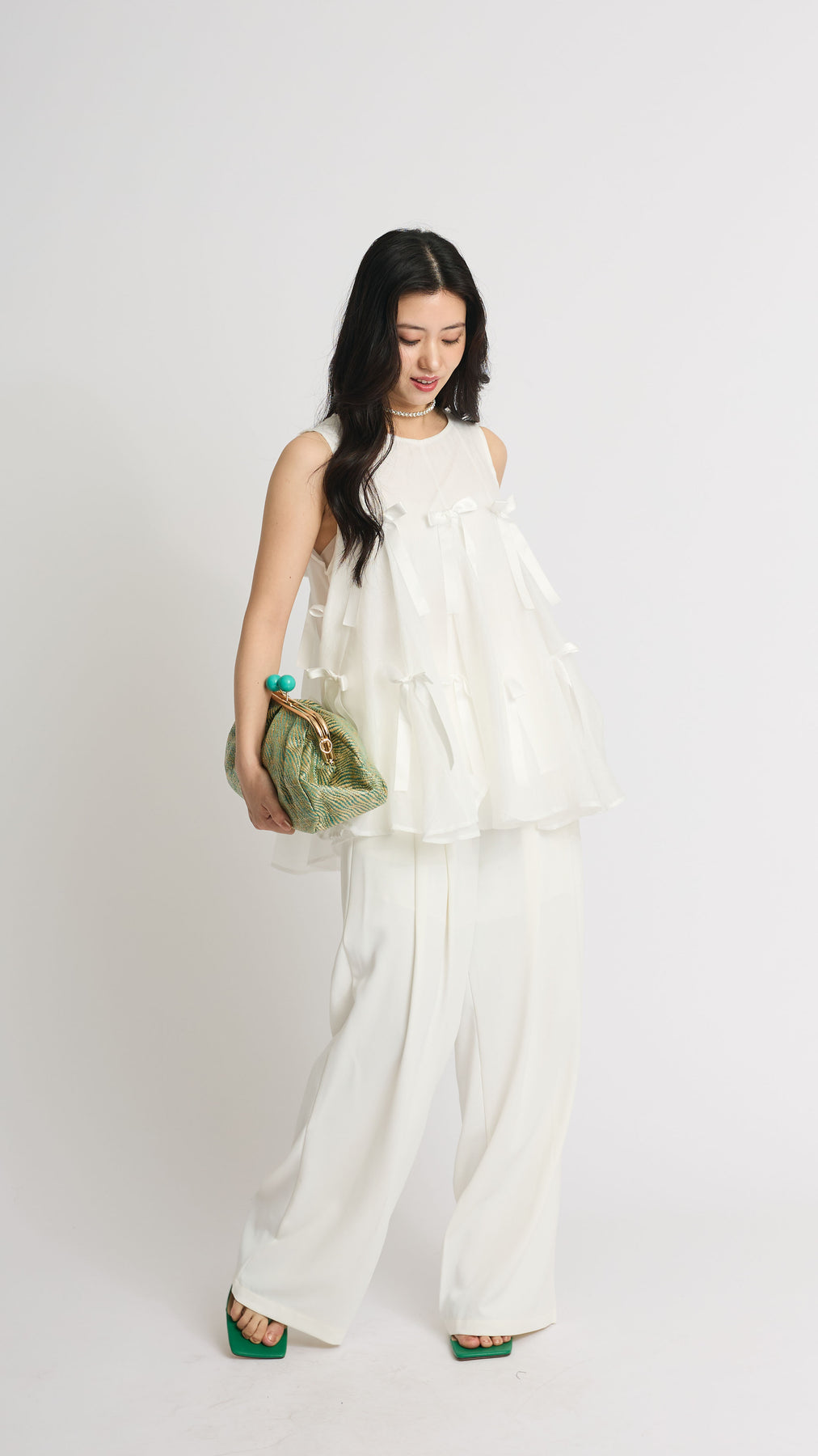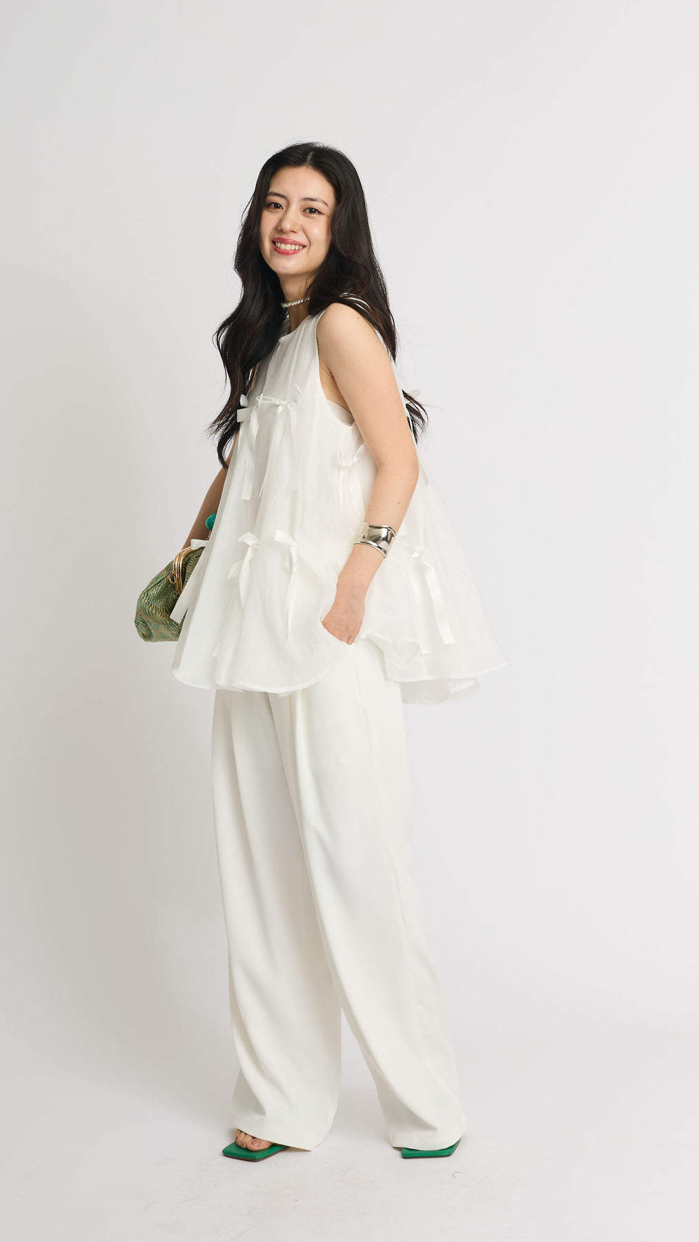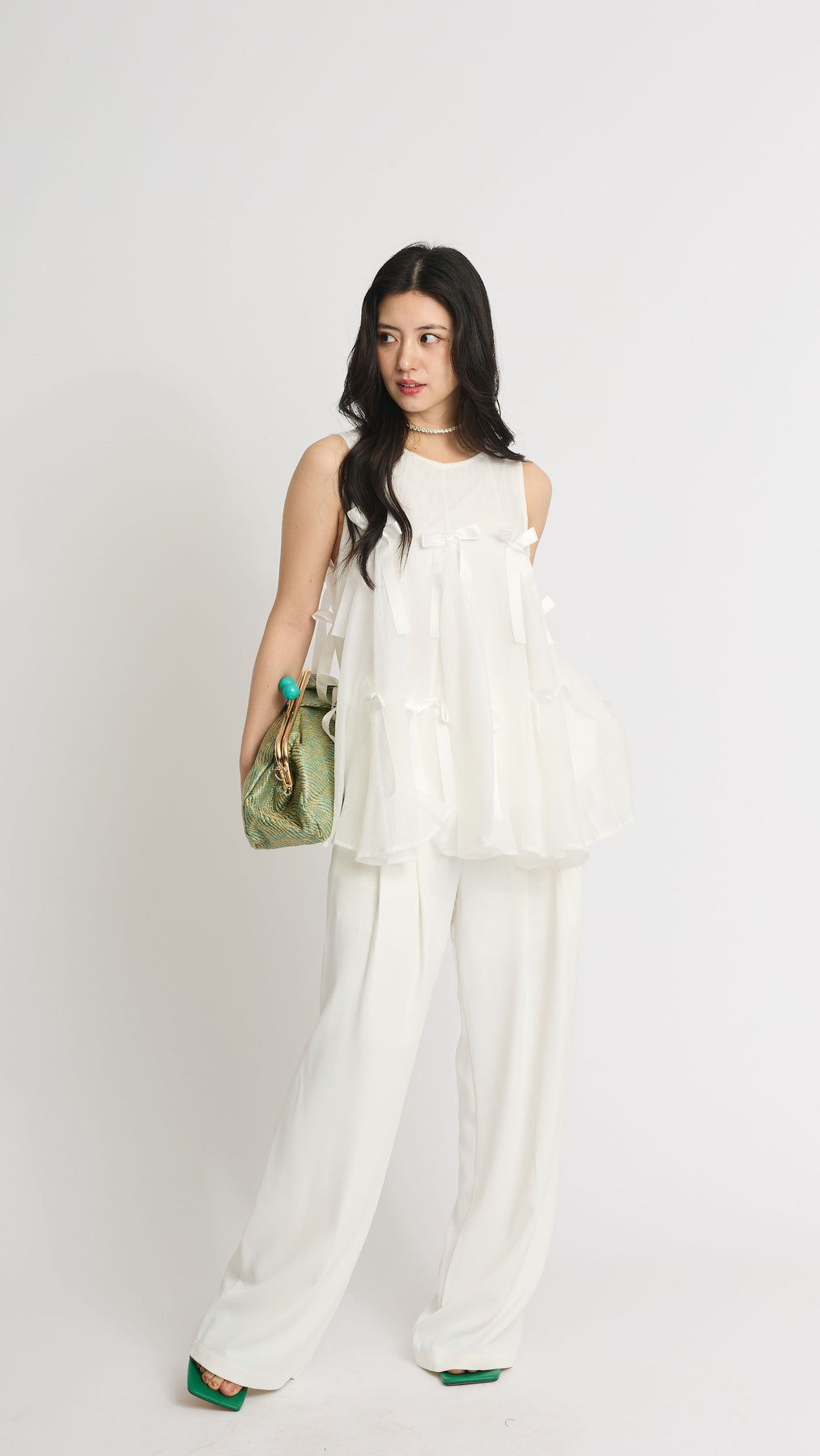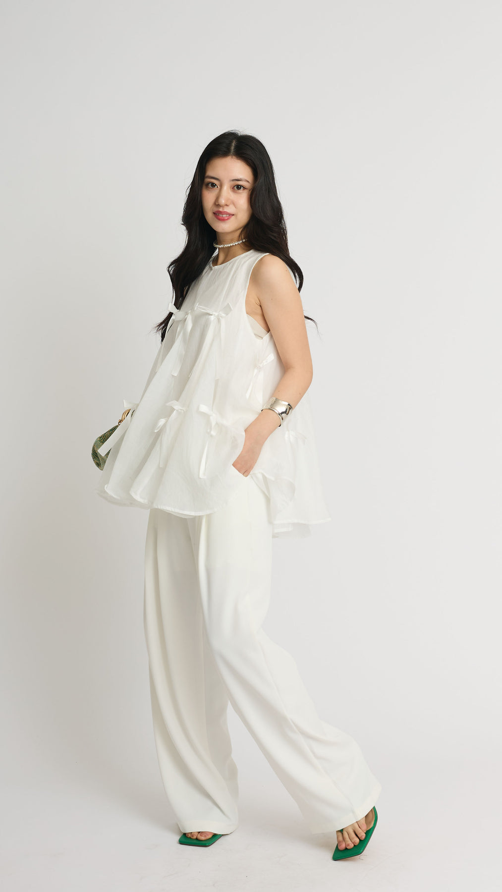 ふわりと広がるAラインシルエットに、可憐なサテンリボンをランダムにあしらったチュールトップス。軽やかな透け感と立体感のあるリボンが動くたびに揺れて視線を集めます。ボリュームがありながらもシアー素材なので抜け感があり、ワイドパンツやスリムパンツと合わせるだけで、洗練されたモード感漂うコーデに。結婚式の二次会からカジュアルなパーティまで、幅広いシーンに活躍する一着です。