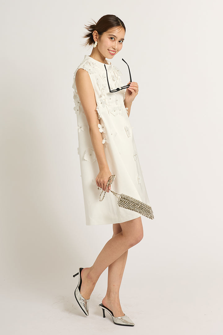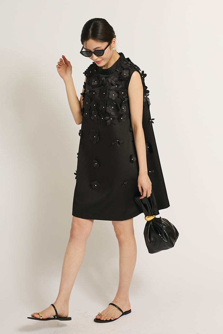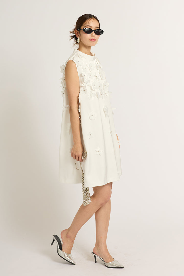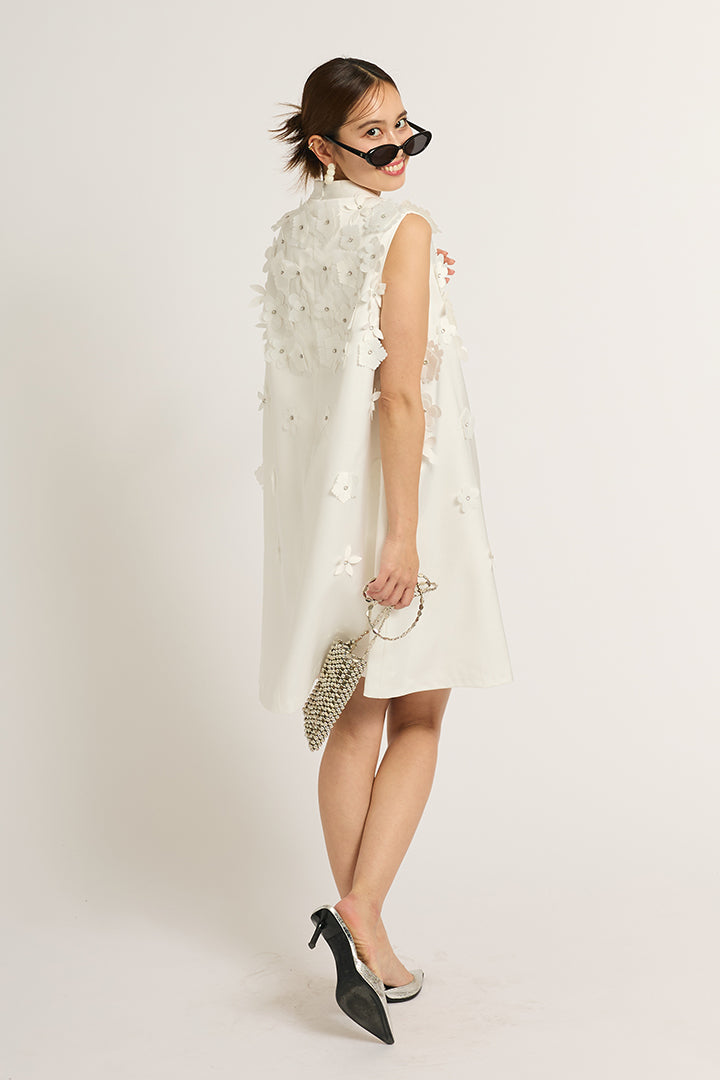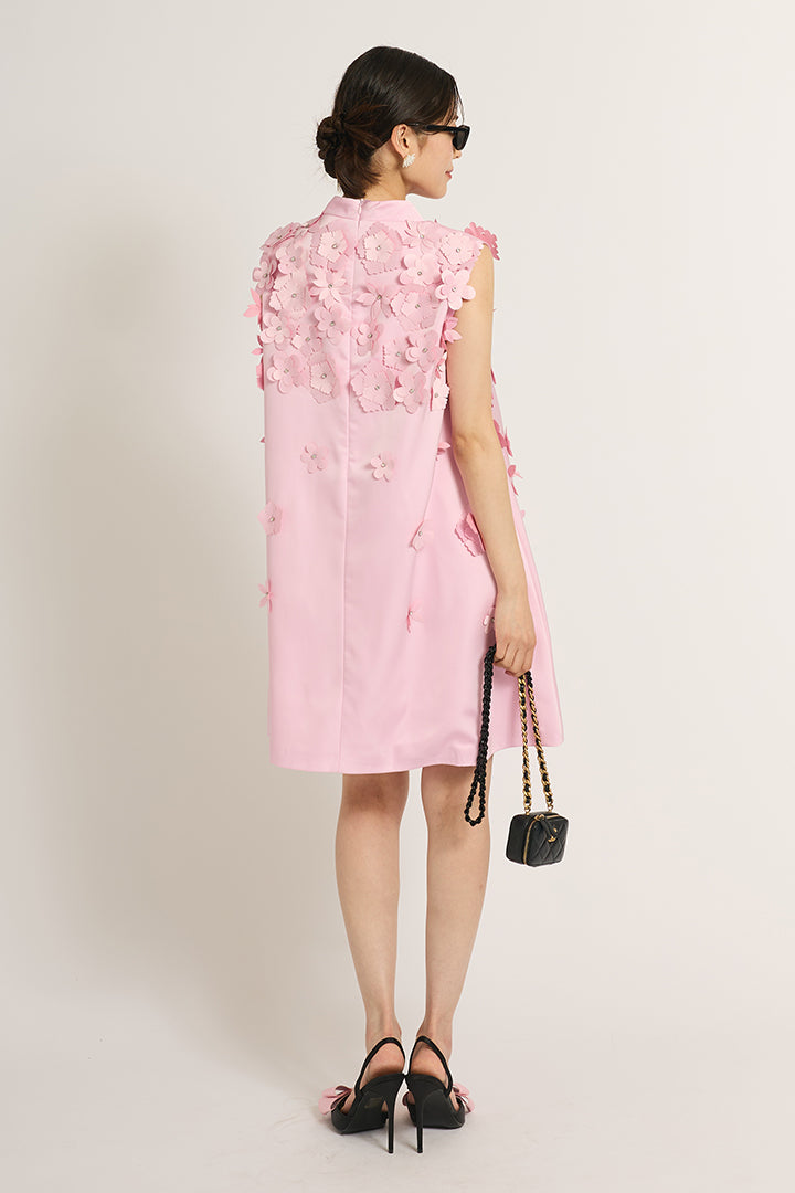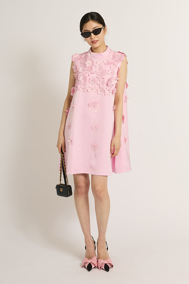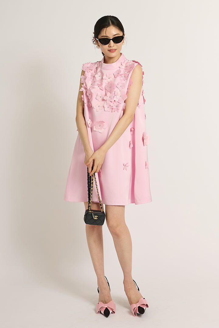 大胆にあしらわれた立体フラワーモチーフが視線を惹きつける、存在感抜群のミニドレス。 コクーンのようなシルエットで体のラインを拾わず、抜け感とモード感を両立した一枚です。 上品で可愛らしいベビーピンクのカラーに、遊び心のあるフラワーディテールが華やかさをプラス。 シンプルなアクセサリーやサングラスと合わせて、パーティーからアートイベントまで映える着こなしが完成します。 主役感たっぷりなのにリラックスして着られる、そんな“可愛いだけじゃない”大人のピンクドレスです。